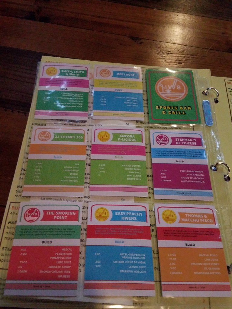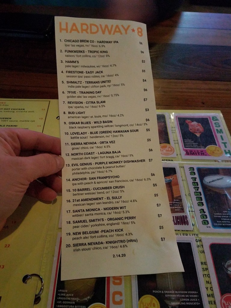 The Hardway 8 in Henderson has a pee chee folder cover and baseball card style menu for the drinks. It is an inventive way to display their beers. Excellent Henderson choice. I had the fried bologna sandwich and it did not disappoint.
