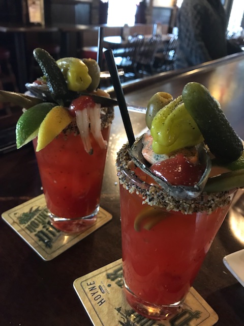 There are a few differences in bloody marys in Canada. They call them Caesar Cocktails. Bartholemews Pub Downtown makes a full meal in their Caesar.They call it the Signature Double Seafood Caesar and it has and Oyster AND a jumbo shrimp. Yum Yum.